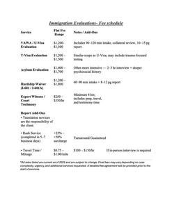 Clinical assessment includes consultation with the immigration attorney and two separate interviews with the primary client. Each interview is one hour in length, in office or telehealth is available. If necessary, interviews with any relevant family members.